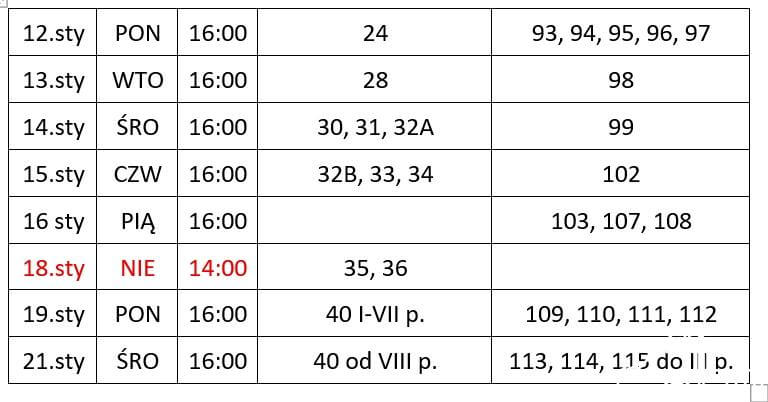 Kolędę rozpoczynamy o 16:00 w soboty o 13:00, w niedziele o 14:00.