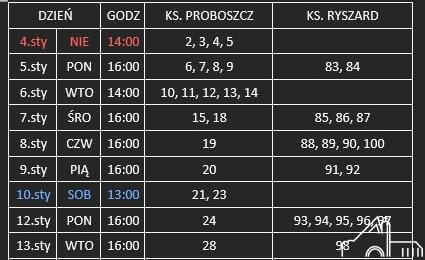 Kolędę rozpoczynamy o 16:00 w soboty o 13:00, w niedziele i 6.01 o 14:00.