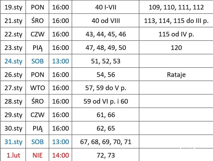 Kolędę rozpoczynamy o 16:00 w soboty o 13:00, w niedziele o 14:00.